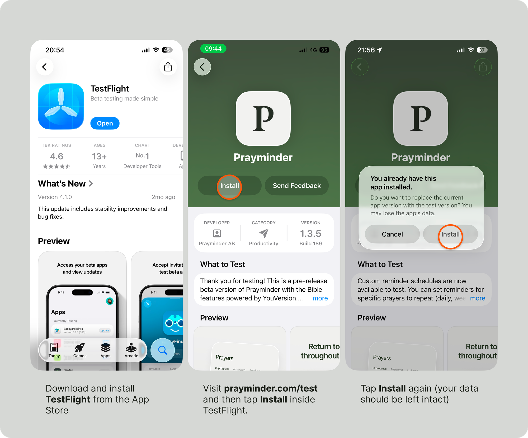 Today, we’re opening up the first public beta of Prayminder with the Bible included, available through TestFlight.