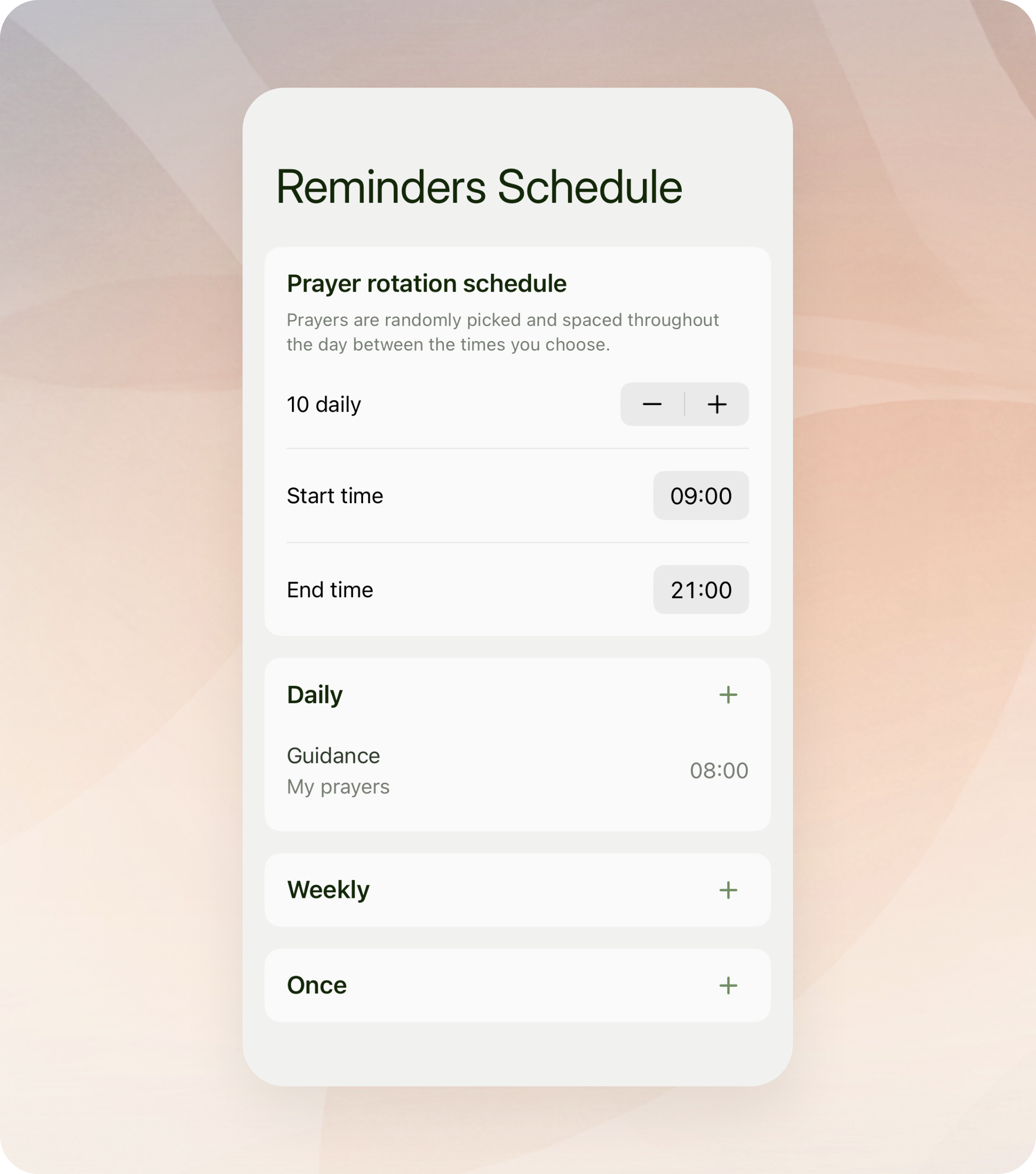 One of the most requested features is here: you can now set custom prayer times for your reminders. Choose exactly when certain reminders should appear, whether that means beginning every morning with a prayer of surrender, ending each week with a prayer of gratitude and reflection, or placing a one-time prayer before an important event or milestone. Your selected prayers will show up at the times you define, while the rest of your reminders can continue to rotate as usual.
